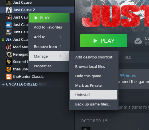 Uninstall the game. Simply go to your game-library, find Just Cause 2 in your list of games and right click it. In the popup, click on manage, then on uninstall
